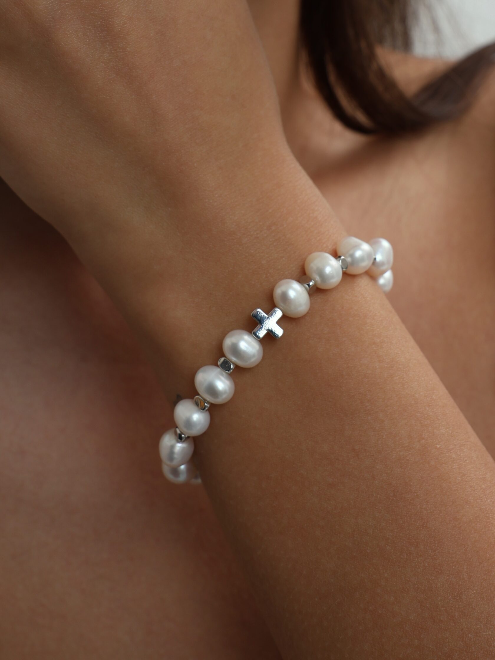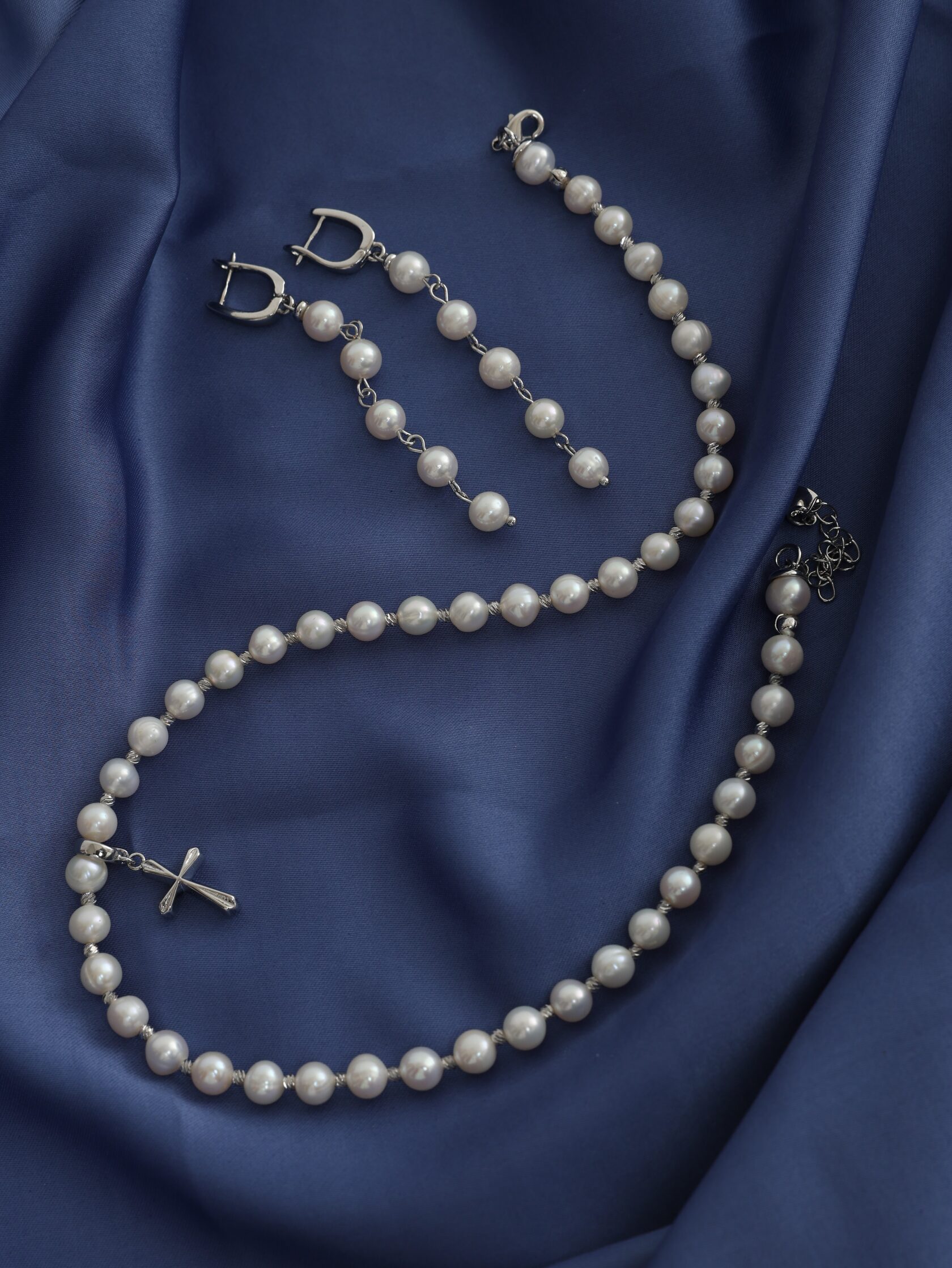 Ожерелье со съемным крестом и серьги ручной работы. Длина: 40 см. + 5 см. цепочка. В ювелирной коробочке. Состав: культивированный жемчуг 6 мм, люкс фурнитура с покрытием родием.